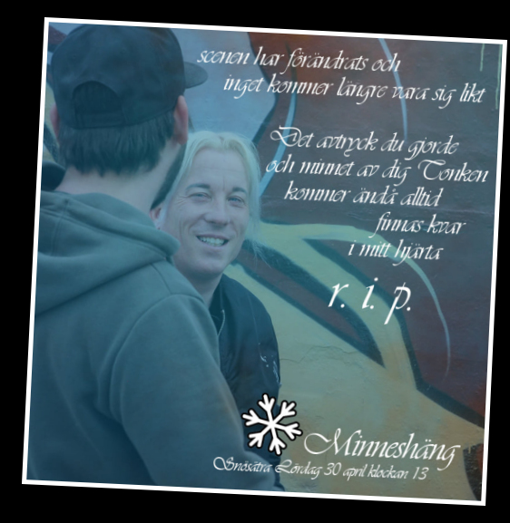 Minneshänget ute på Snösätra blev en imponerade föreställning där vännerna från gatan skapade små och stora minnestavlor med hyllningar till sin bortgångna polare. Hans storebror Jonas var naturligtvis där och blev central i skapandet på väggarna. Det var hans sätt att skingra tankarna och bearbeta sorgen - att måla över sorgen med sprejfärg och hylla sin lillebror. Stämningen var uppsluppen och demonstrerade verkligen vad Tonk The Trooper åstadkommit. Han borde varit där och fått all bekräftelse, men så funkar det inte, även om flera nämnde de klassiska orden; hoppas han ser oss nu där uppifrån. Även om Patrik inte var troende på klassiskt vis var han spirituell och funderade mycket på vad som händer efter döden. Han hade uttryckt en oro för vad som händer med personer som tar sitt liv och själv beslutar sitt öde, berättade Silver.