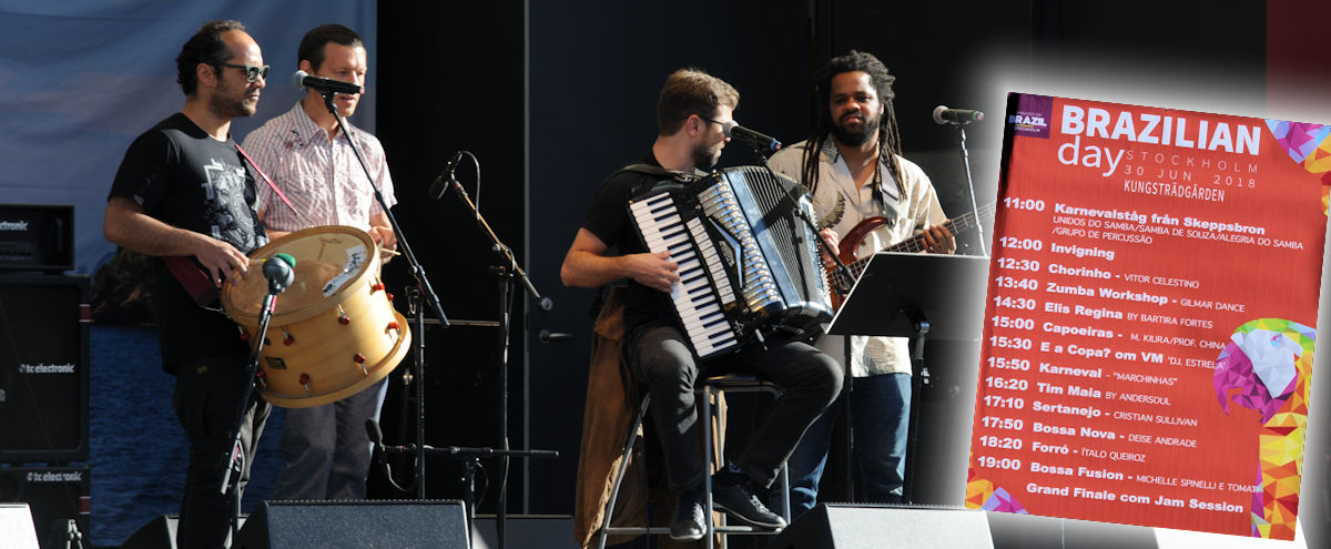 Föreningen Unidos do Samba med slagverksorkester och dansare från den Svenska sambaskolorna Samba de Souza och Alegria do Samba bildade ett litet karnevalståg som klockan 11 lämnade statyn över Gustav III nedanför slottsbacken för att i sakta rytmiskt mak bege sig mot Kungsträdgården.