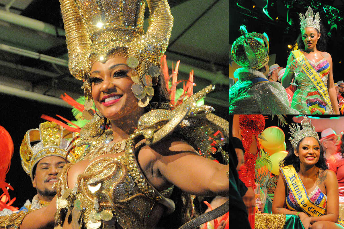 Camila Silva Rainha da Bateria, Trummornas Drottning, intog scenen i en fantastisk dräkt med mycket guld och ormar som slingrade sig kring hennes axlar. Efter det obligatoriska karnevalståget genom stora salen korades hon till karnevalens drottning till publikens jubel.