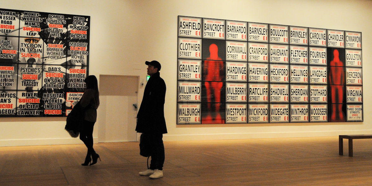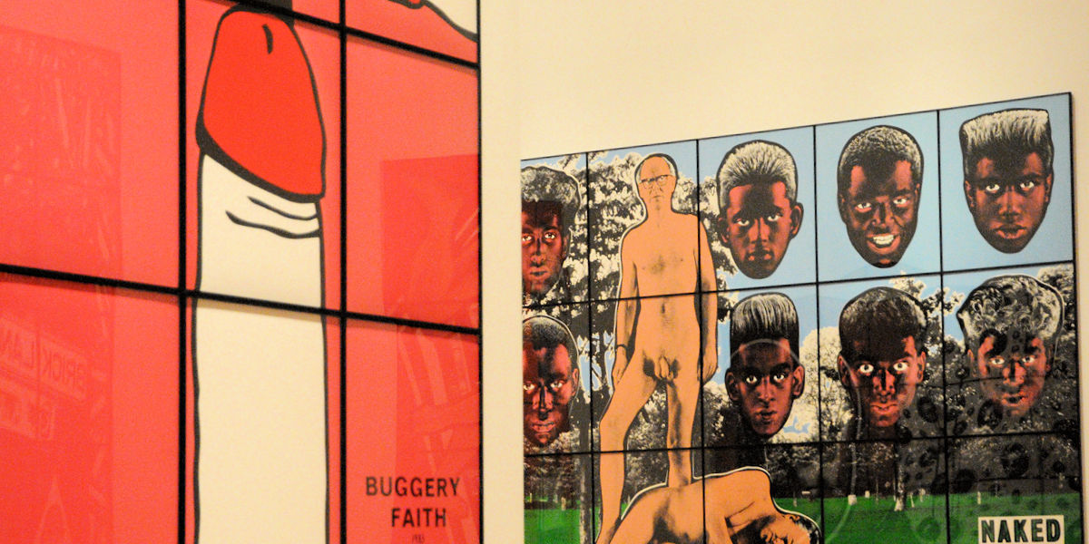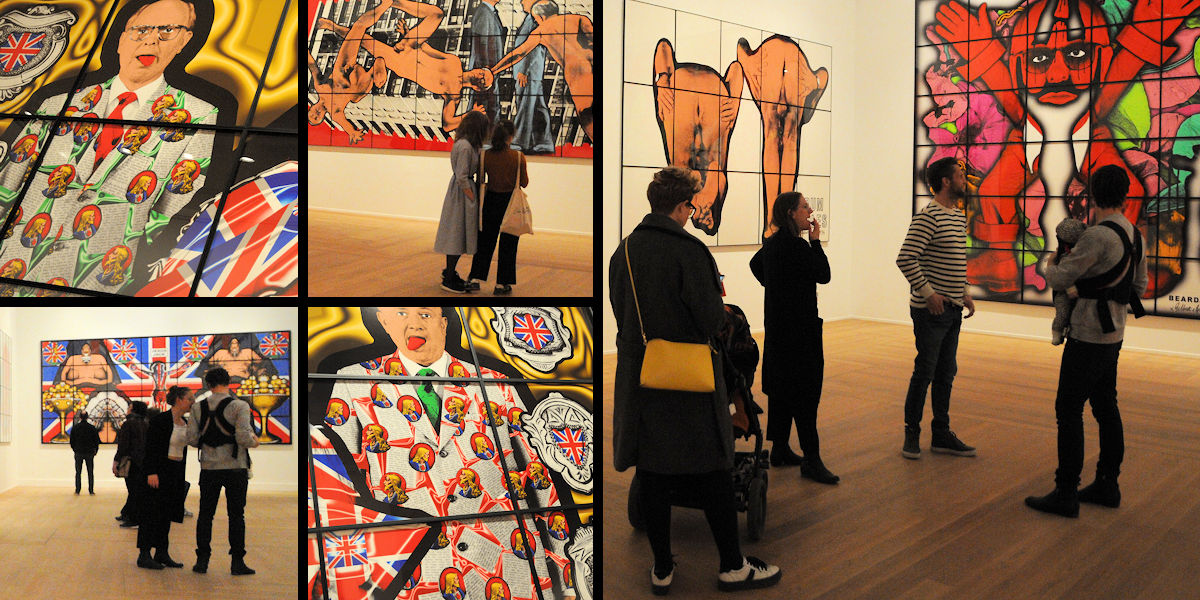 Själv tycker jag att bilderna tillsammans med dessa underfundiga och propert klädda män skapar en nyfikenhet samtidigt som det är en käftsmäll till alla oss som bara flyter med längs normalen och räds det som sticker ut och är annorlunda. Jag blir fascinerad av tekniken och de färgglada verken med den enorma detaljrikedomen, samtidigt som jag blir medveten på ett sätt som påminner om en nyhetssändning med fasansfulla inslag mixade med glada och lättsamma ämnen; Death, Fear, Hope, Life (1984), Shitty, Naked, Human, World (1994) och Sex, Money, Race, Religion (2016).