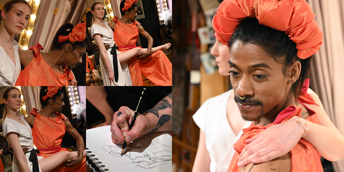 Bryta mönster och tänka utanför ramen utmanar och gör oss överraskade. Något som behövs för att aktivera kreaktivitet och skaparglädje. Tror att de flesta har en ganska bra bild av vad teckna croqui innebär, men när jag fick inbjudan och lokalen var La Petite Mort förstod jag att detta var något annorlunda och blev intresserad. La Petite Mort på Grevgatan invid Karlaplan är Linda Lindgrens studio, butik och showroom och Linda är en av våra stora klädskapare, med kreationer som burits av både Dragqueens och Mellopresentatörer. Linda och jag brukar stöta på varandra i olika sammanhang där vårt gemensamma intresse för Burlesque och Pride ryms, men det var första gången jag besökte henne på hemmaplan. Den svartvita bilden nedan är från ett evenemang på House of Q och Club Nexus februari 2026.