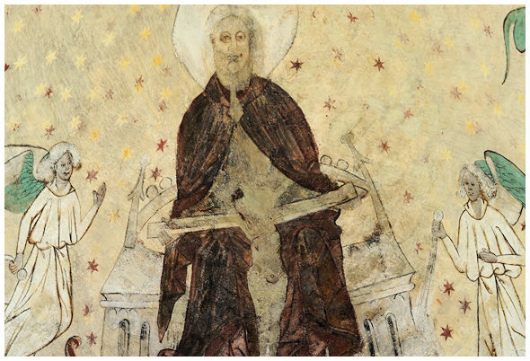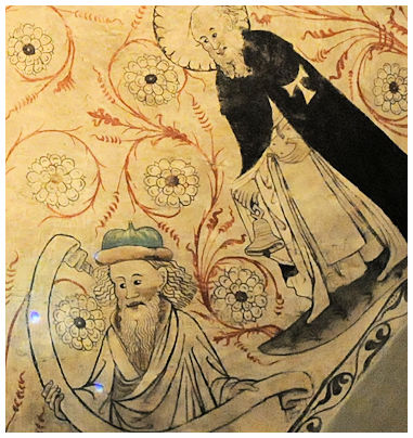 Ovan till höger ett porträtt av S:t Antonius Erimiten. Han levde i Egypten i slutet av 200-talet, början av 300-talet och räknas som munkväsendets grundare. Framför honom ser vi en profet som håller upp en textremsa med sin profetsia. Dessa profetbilder med sina budskap återfinns i valvet längst västerut och det som möter besökaren först. Innehållet på textremsorna målades sannolikt över vid restaureringen på 1800-talet då även ett par av helgongestalterna i dessa valv förvanskades i enlighet med tidens krav. Målningarna i valven på 1600-tals kapellet, nedan till höger, är liksom tornrummets målningar tidstypiska för 1600-talets Sörmländska måleri.
