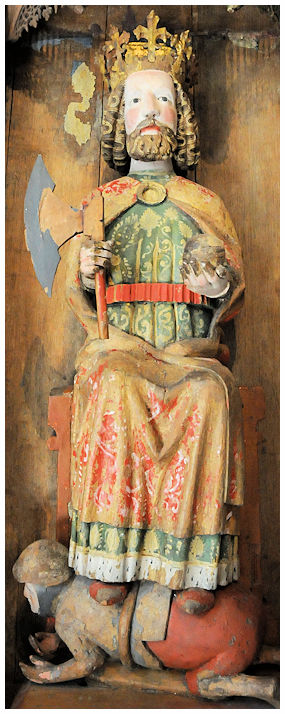 De fantastiska träskulpturerna av de bägge helgonkungarna kan vara av äldre datum än själva skåpet. Figurstil och dräktdetaljer antyder detta. Det är möjligt att skulpturerna tillverkades redan på 1300-talet för att senare placeras i skåpet vid 1400-talets mitt då de även försågs med en ny polykromi. Notera den så kallade underliggaren vid S:t Olofs fötter. En symbol för den besegrade religionen och dess anhängare.