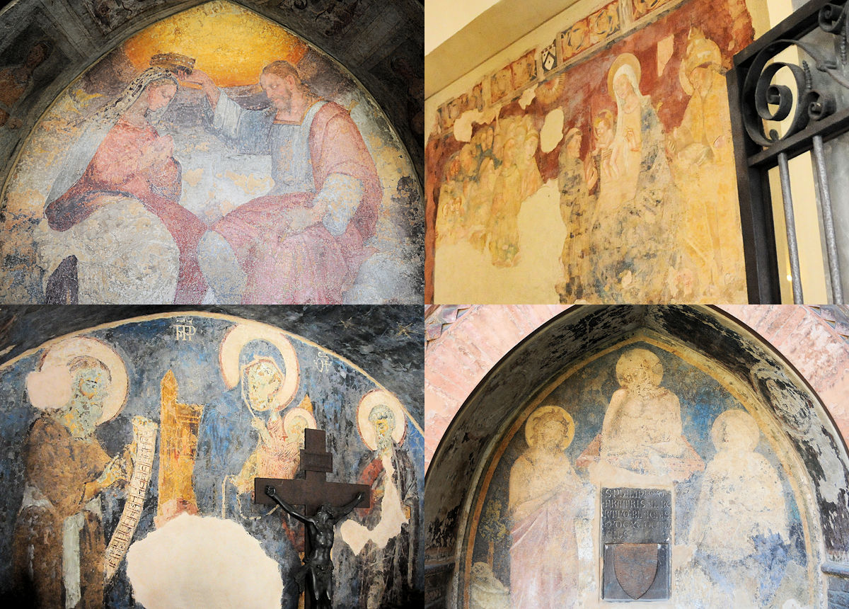 Altartavlan på bilden oven till höger med Madonnan är ett bavarat fragment från originalfreskerna målade på 1300-talet. I en av arkaderna ute på gården i en fönsternisch står på en pelare en stenstaty, Gallo di San Pietro, Sankt Petrus Tupp. Bilden nedan till höger. En 1300-tals skulptur som ska påminna om Jesus ord till Simon Petrus; innan tuppen galer ska du ha förrått mig tre gånger. Bilden nedan till vänster är från museet och ett verk av den flitigt anlitade 1300-tals konstnären Simone dei Crocifissi, som även skapade krucifixet i Heliga Korsets kyrka. De avbildade är helgonen St Benedetto, St Procdo och St Sisto och betydelsfulla för Bologna och provinsen.