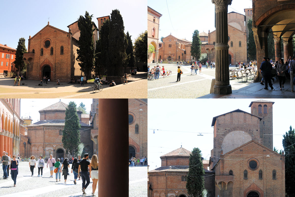 Via Santo Stefano leder fram till ett triangelformat vackert torg, Piazza Santo Stefano, som öppet och välkomnande bjuder in till detta Bolognas Jerusalem, en orgie i Kristendomshistoria. Många andra fornkristna monument som till exempel San Vitale i Ravenna från 500-talet saknar naturlig anpassning i en uppdaterad detaljplan, men här harmoniserar omgivningen med de gamla monumenten och nivåskillnaderna är utjämnade, vilket skapar en helt fantastisk känsla. En resa i tiden som skapar gåshud. Något som fascinerar mig är att kyrkokomplexet tillsammans med torget och de medeltida arkaderna är så levande och människorna har en sån naturlig del i den fornkristna kontexten. I långt över tusen år har människorna samlats här för ett glas, en bit mat eller bara för att dela på lite skvaller och sedan smita in i kyrkan för några Ave Maria. Hela den här stadsdelen är ett museum, men ett levande museum med en tämligen avspänd och naturlig stämning.