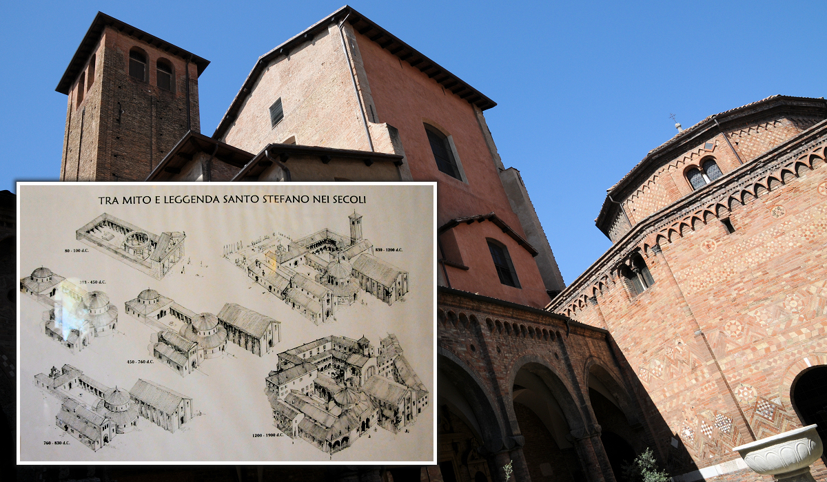 Basilica di Santo Stefano är inte en kyrka utan samlingsnamnet på en grupp Kristna byggnader i centrum av Bologna. Bolognaborna kallar komplexet för Sette Chiese, sju kyrkor och i det vi idag kallar den Katolska världen klassas hela gruppen som en basilicae minores, ej att förväxlas med den arkitektoniska termen basilika. Basilicae maiores är de fyra allra viktigaste och första kyrkorna alla placerade i Rom. Redan under Romersk tid fanns här i Bologna ett religiöst centrum med ett tempel uppfört på 80-talet till gudinnan Isis ära. Äldst i nuvarande kluster av Kristna byggnader är Basilica dei Santi Vitale e Agricola, bilderna ovan. Nedan en skiss av utvecklingen från 80-talets tempel fram till 1900-talet.