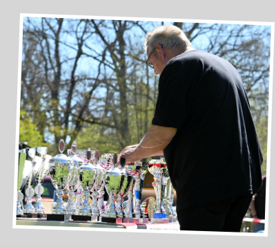 Pokalerna skulle ställas upp på podiet och i en ordning, som skulle underlätta vid prisutdelningen. De deltagande bilarna skulle också granskas, så när pokalerna var på plats for han runt med sin pärm och granskade presumtiva vinnare.