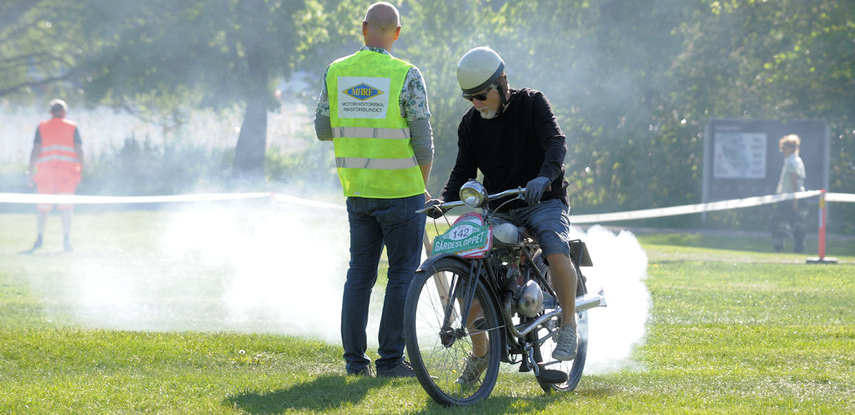 Klockan 8:00 var det samling på ängen vid Solna Tingshus för de fordon som anmält sig till kortegen genom Stockholms innerstad och ut till Djurgårds Brunn. Allt som rullar på två eller flera hjul och är äldre en 30 år är välkomna att delta. I anmälningsavgiften ingår en frukostpåse som blev extra njutbar i det härliga vädret. Kortegen med historiska bilar, bussar, lastfordon, motorcyklar, mopeder och cyklar lämnade Haga Södra Grindar 8:50 och klättrade på den gamla landsvägen upp på kullen i Bellevue för att sedan leta sig ner till Sveavägen och vidare. I likhet med förra året fuskade jag och deltog oanmäld med min lite för nya Aprilla Mojito 50cc. Tycker ändå att den passar in lite grann. Först åkte jag i förväg upp till Bellevue och satte mig på en bänk tillsammans med två andra gubbar utanför Carl Elds gamla ateljé. Där inväntade jag kortegen och tog några bilder innan jag anslöt mig i en grupp med gamla mopeder och en MC.
