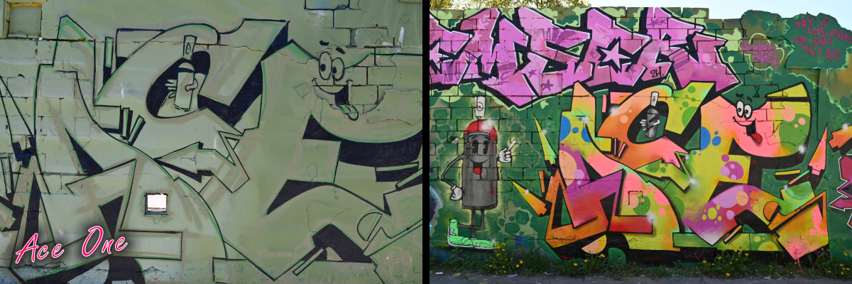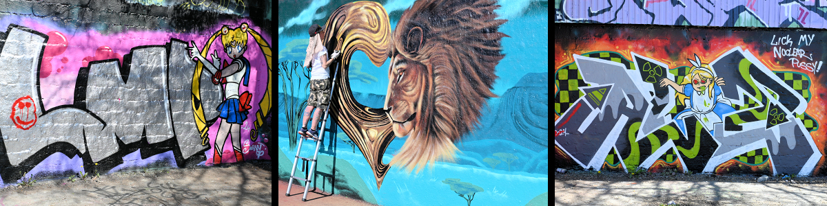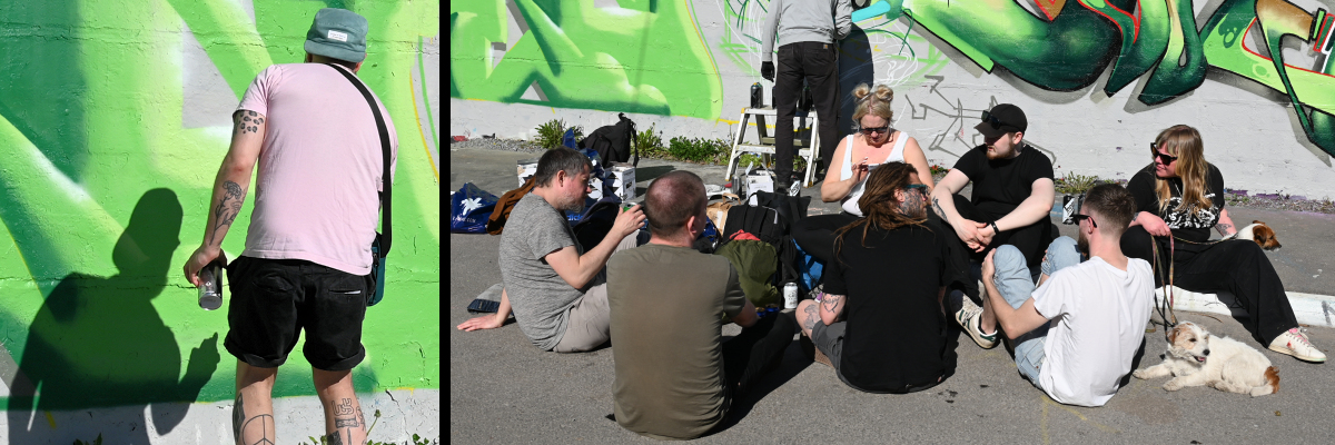 Fördelningen av vägg till konstnärerna såg lite annorlunda ut i år. Tre veteraner @ironartworks, @veganflava och @hugeart hade tilldelats väggar i ett av föreningens rum till vänster om den stora scenen. Vi diskuterade för- och nackdelar med placeringen och kom in på ämnet skadegörelse. -Det är märkligt att det är ok att ge sig på våra verk här ute medan coca-cola och andra varumärkens reklamskyltar i city lämnas i fred, konstaterade Vegan Flava.
