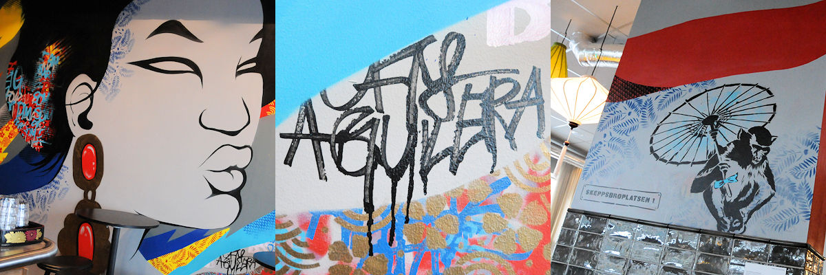 Det har också blivit vanligare och vanligare att dekorera med streetart inomhus. Allt från privata hem till hotell och restauranger. Under vistelsen i Göteborg bodde jag och min fru Ingela på Comfort Hotel vid Stenpiren. Ett hotell integrerad med OGBG Bar & Restaurang, ett vattenhål och samlingsplats med mat inspirerad av det ostasiatiska gatuköket. Interiören toppas med dekorationer av Caty Aguilera, som hämtat både teknik och motiv från gatukonsten.