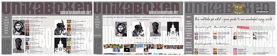 Det har hänt en del genom åren. Hårddiskar har kraschat och originalfiler försvunnit. När sajten renoverades 2021 i samband med 20-års jubiléet sparades delar av den gamla strukturen och två sidor skapades för att beskriva hur allting en gång började. Dessa sidor finns fortfarande med i vänsternavigeringen på sajten medan detta jubileumsreportage mer är tänkt som ett collage av bilder för att beskriva utvecklingen och hur Unikaboxen.net blev det digitala magasin som finns idag. Bilden är i centrum och den bildbank som skapats genom åren med eget material är källan som jag öst ur för att hitta minnen och händelser som påverkat och skapat de intressesfärer som idag delar upp sajten i åtta kategorier. Collaget nedan visar hur jag till en början arbetade och manipulerade andras bilder. Mitt eget fotograferande fick betydelse för sajten långt senare. Bilden med den Amerikanska flaggan är den äldsta bildfilen jag hittat och är från februari 2002.