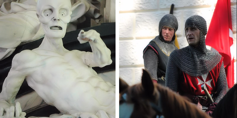 Från vänster detalj från Domkyrkan i Västerås med nutida korsriddare i en uppvisning på Rosersbergs slott. Foto Tommy Sörstrand.