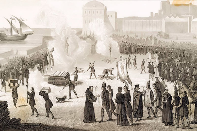 Den spanska inkvisitionens första kättarbål ägde rum i staden Sevilla år 1481. Med tiden blev bålen spektakulära föreställningar som lockade stora skaror av åskådare. Bild hämtad från Wikipedia.