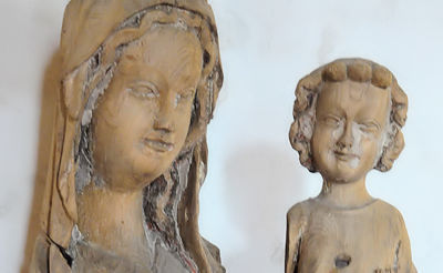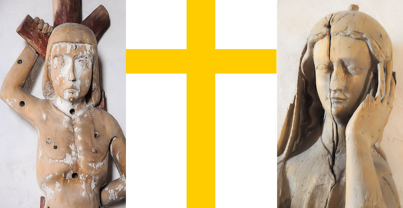 Det gula korset Katarerna tvingades bära av Inkvisitionen flankerade av medeltida träskulpturer från Åbo slott. Foto Tommy Sörstrand.
