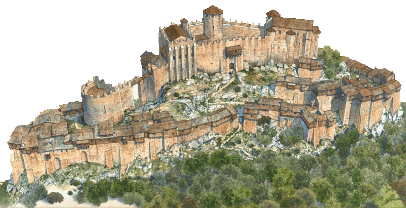 Rekonstruktion av Katarernas sista fäste i södra Frankrike, borgen Montségur i Pyrenéerna. Illustration hämtad från Wikipedia.